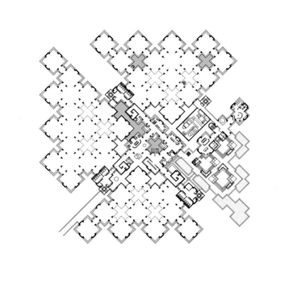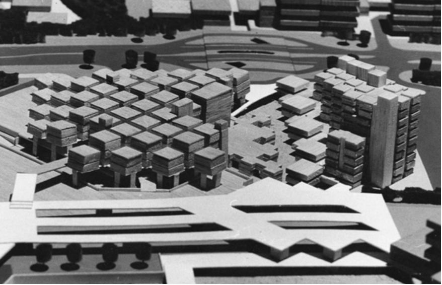 We see a similar expansion of the notion of what it means to live in a place in Hertzberger’s almost residential approach to the design of the Centraal Beheer office building. Just as where we are taught is a micro-community, so becomes the place where that education leads us, where we work. The arrangement of four cubicles that overhang onto a crucifix shaped plaza to face each other as seen in figure 3, initiates a dialogue between the individual and their collective, that is reminiscent of historic European town squares bordered by apartment balconies (especially as there is greenery, which externalises the modules). We sense from this that there is a universal relationship between self and others that Hertzberger felt was important to transfer to the functions of modern architecture, whose ‘only possible future lies in the past.’5 The connection to European city planning is repeated from an aerial perspective, as in figure 4, the pattern of structures and spaces in between form the illusion of the ‘street pattern of a medieval town’6. Its elevation from ground level marks its modernity, layering it on the foundations of the past, an allusion to the structuralist paradox of reformation under invariant principles.