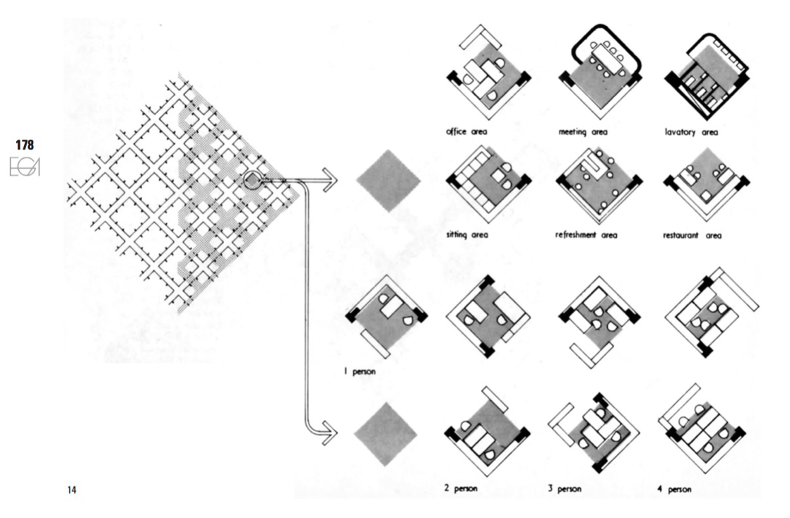 Hertzberger parallels his interest in the individual and collective with the relationship of nature to culture, animating the Centraal Beheer building with its capacity for change. The diagrams of figure 5 visualise Hertzberger’s polyvalency concept, as the form ‘without changing itself can be used for every purpose.’7 This also features in his design of De Drie Hoven, an aged care home that limits reallocation as needs change as the rooms go through the cycle of life with the user. Structuralism’s link to anthropology presents itself here, there is a universal human nature, represented by Hertzberger as the recurring module, that is expressed in different contextual ways, just as the programme within Hertzberger’s module shifts.