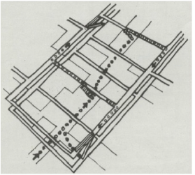 Figure 2: Unknown, Groundscaper typology creates meandering style of circulation, shown in dotted line, C. 1960, drawing.