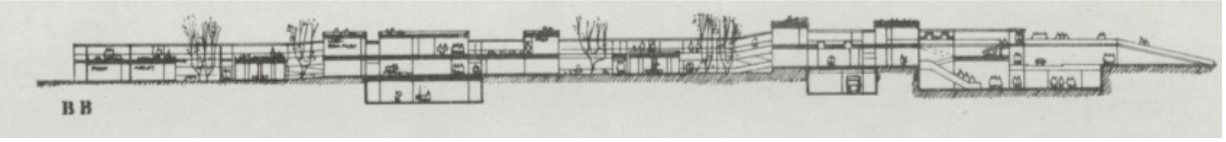 Figure 12: Herman Hertzberger, Section of Berlin Free University showing courtyards defined by roof height changes, C. 1972, drawing.