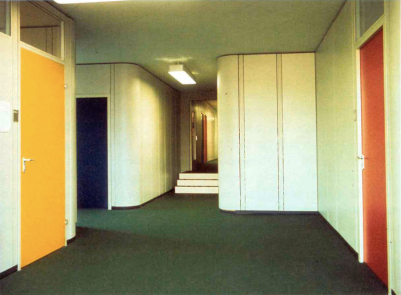 Figure 7: Unknown, Classrooms identified by colour coded system and face onto shared corridor, C. 1965, photograph.